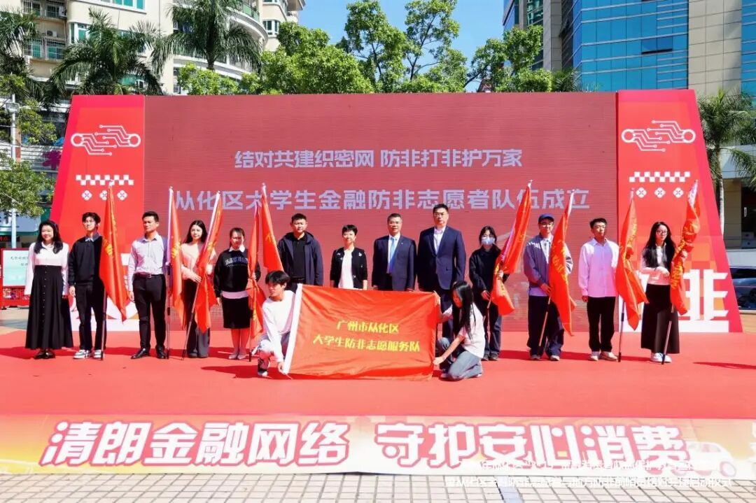团区委等领导为从化辖区9所高校大学生防非志愿者代表授旗,标志着高校力量正式加入防非宣传队伍,为基层治理注入青春活力。